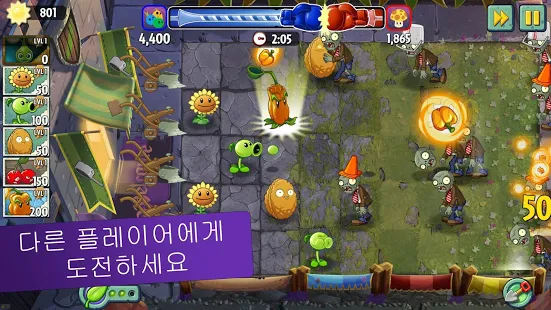해바라기, 완두콩 슈터처럼 인기있는 잔디밭 영웅과 함께 용암 구아바, 레이저 콩같은 창의적인 식물 꽃도 수집해 보세요. 제트팩 좀비, 인어 임프같은 강력한 좀비 무리로 각 턴마다 상대와 정면으로 부딪치세요. 또한 사납게 날뛰는 좀비 닭으로부터 자신의 뇌를 지켜야 합니다!