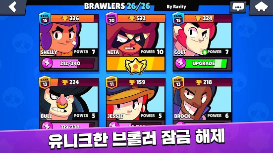 강력한 특수 공격 능력을 지닌 다양한 브롤러를 잠금 해제하고 업그레이드하세요! PP를 모아 브롤러를 업그레이드하고 특별한 스킨을 수집하세요!