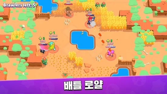 - 쇼다운 (솔로/듀오): 생존을 위한 배틀 로얄 스타일의 게임 모드입니다. 브롤러의 파워업을 모으세요! 2인 또는 1인 모드로 플레이하며, 소란스러운 전장에서 최후까지 살아남으세요! 승자가 모든 것을 차지합니다!