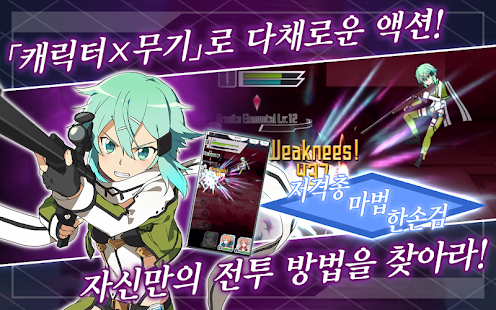 원작과 애니메이션에 등장하는 키리토와 아스나, 리파, 시논 등 개성 넘치는 캐릭터들을 손가락 하나로 자유롭게 조작하면서 다양한 스킬을 구사하여 강적들을 쓰러뜨리고 스테이지를 클리어 해 나가는 것이 이 게임의 목표입니다.