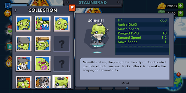 - 감염된 좀비 개, 느린 좀비, 전투기 또는 미친 과학자 등 18 가지 기본 적 유형.