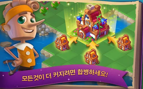 그러나 이것이 전부가 아닙니다! 더 많은 보상을 위해 동전과 보석을 병합하고 모든 풍경과 여러 크기의 나무, 맛있는 간식, 더 많은 땅을 열여주는 마법의 지팡이, 크기가 커지는 보물상자를 합치십시오. 더 많이 합치면 동화 왕국에서 최고의 스토리 북 마을을 건설하기 위한 더 많은 땅을 발견 할 수 있습니다!