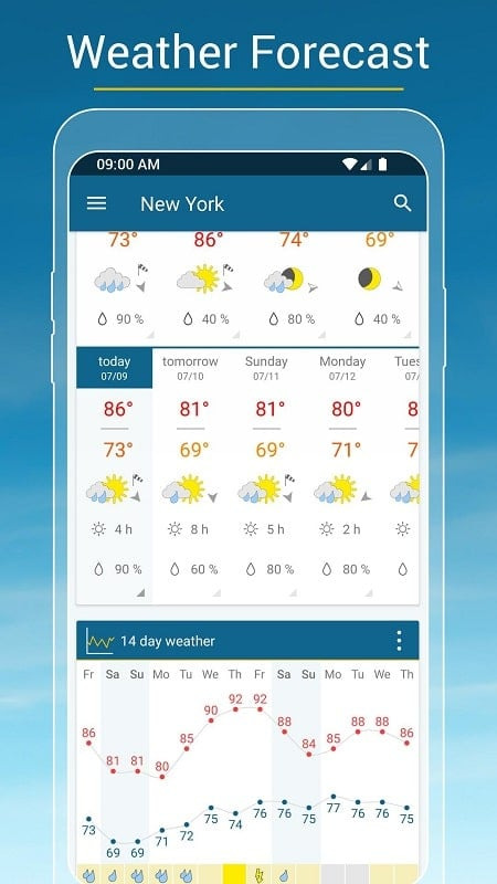 The blue interface representing the sky is the first highlight of Weather & Radar – Pro APK 2024.21. With the presentation of elements from illustrations, information. All of them give us the feeling of watching an accurate weather report. If you want to see the weather in your place, turn on GPS mode, and the system will automatically display your weather information in that location in real-time. Not just today, but every day after that. Everything is almost similar to the weather programs on TV every day. You will see and assess what the weather will be like today and tomorrow. From there, plan for many upcoming tasks to be done.