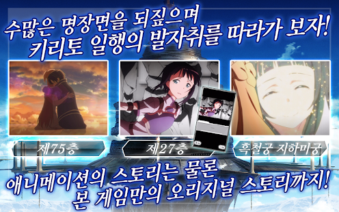 원작과 애니메이션에 등장하는 키리토와 아스나, 리파, 시논 등 개성 넘치는 캐릭터들을 손가락 하나로 자유롭게 조작하면서 다양한 스킬을 구사하여 강적들을 쓰러뜨리고 스테이지를 클리어 해 나가는 것이 이 게임의 목표입니다.